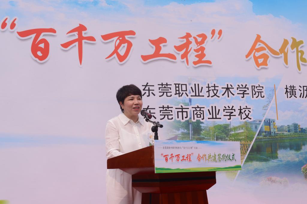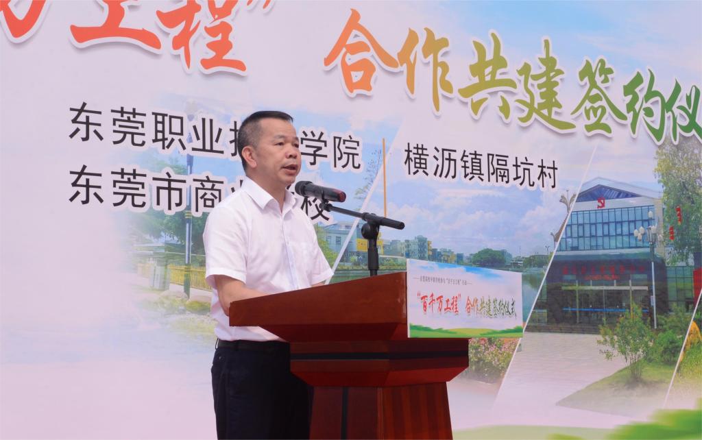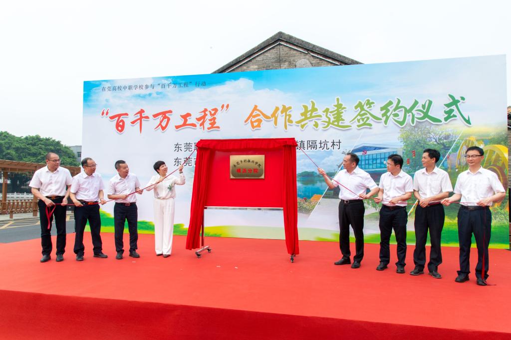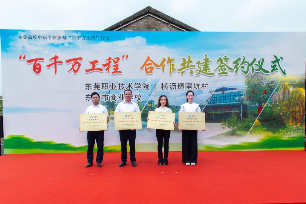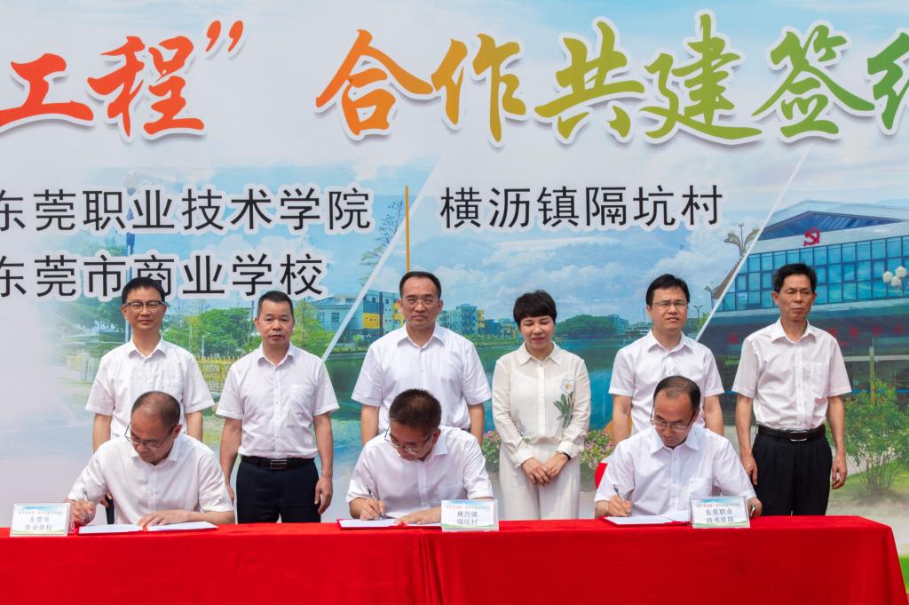 3月29日上午,我校与横沥镇隔坑村及东莞市商业学校在横沥镇隔坑公园举行“百千万工程”合作共建签约仪式。共建代表一同签订《在莞高校中职学校参与“百县千镇万村高质量发展工程”行动协议书》,并为两校“百千万工程”服务突击队进行授牌。