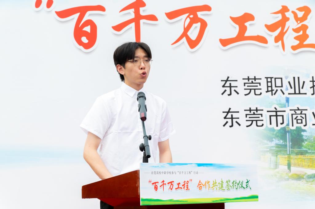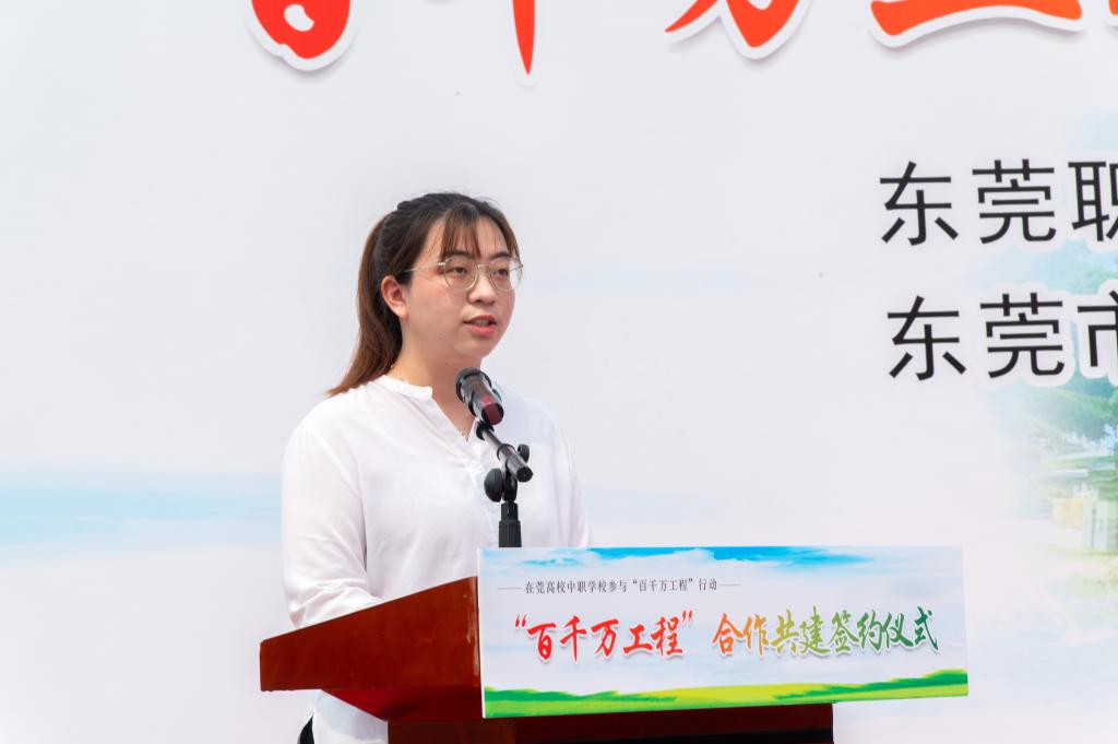 我校师生代表在仪式上发言,他们都希望能以实际行动真正做到“有理想、敢担当、能吃苦、肯奋斗”,将专业知识技能发挥在“百千万工程”的东莞篇章上。