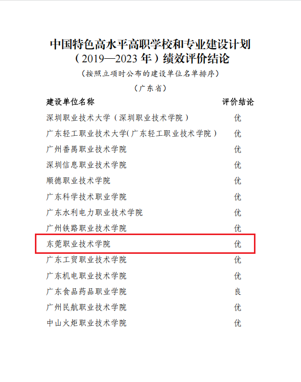 2019年,我校入选国家“双高计划”建设单位。五年来,我校以“双高计划”建设为抓手,强化内涵建设,扩大开放合作,推进特色发展,塑造办学品牌,为职业教育现代化建设贡献了“东莞方案”,取得国家级职业教育教师教学创新团队、国家级职业教育示范性虚拟仿真实训基地、全国职业教育信息化标杆校、全国技术能手、全国优秀共青团干部等国家级标志性成果48类236项、省级100类992项。